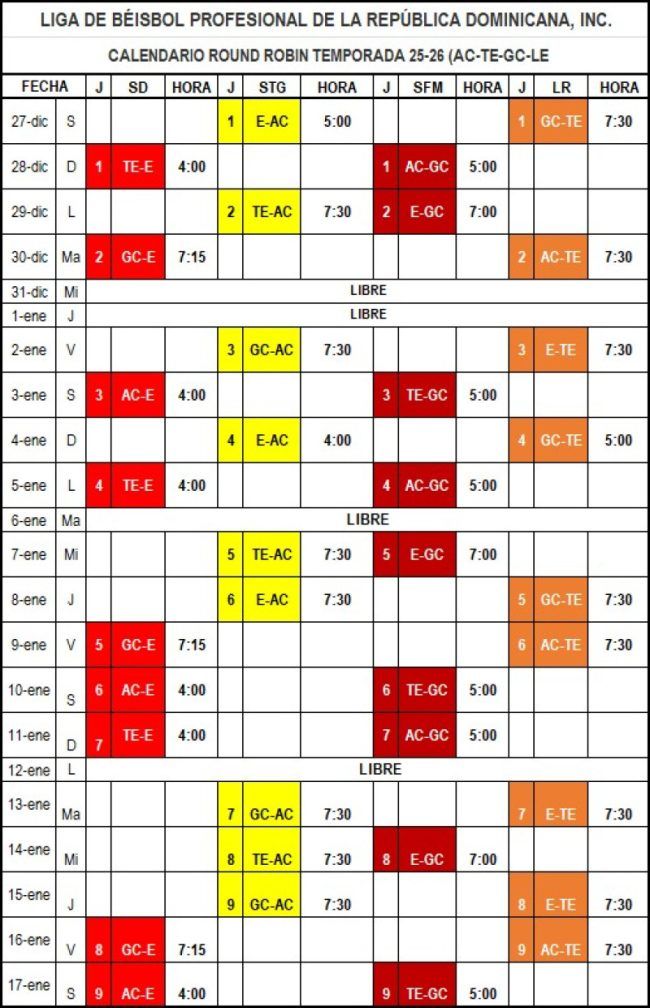 El calendario emitido por Lidom comprenderá cuatro fechas libres, las cuales serán los días 31 de diciembre, 1 de enero, 6 y 12 de enero.