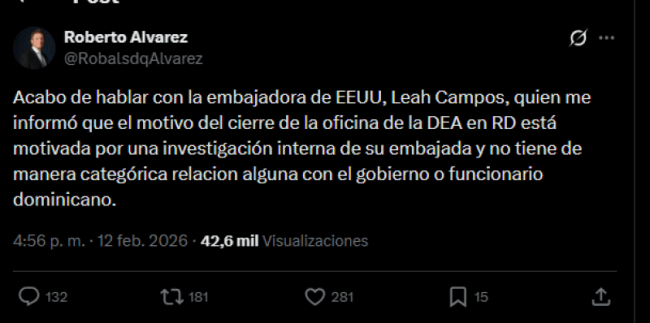 Horas antes el jueves, la embajadora de Estados Unidos en República Dominicana, Leah F. Campos, informó que cerró la oficina de la DEA hasta nuevo aviso sin ofrecer una motivo.