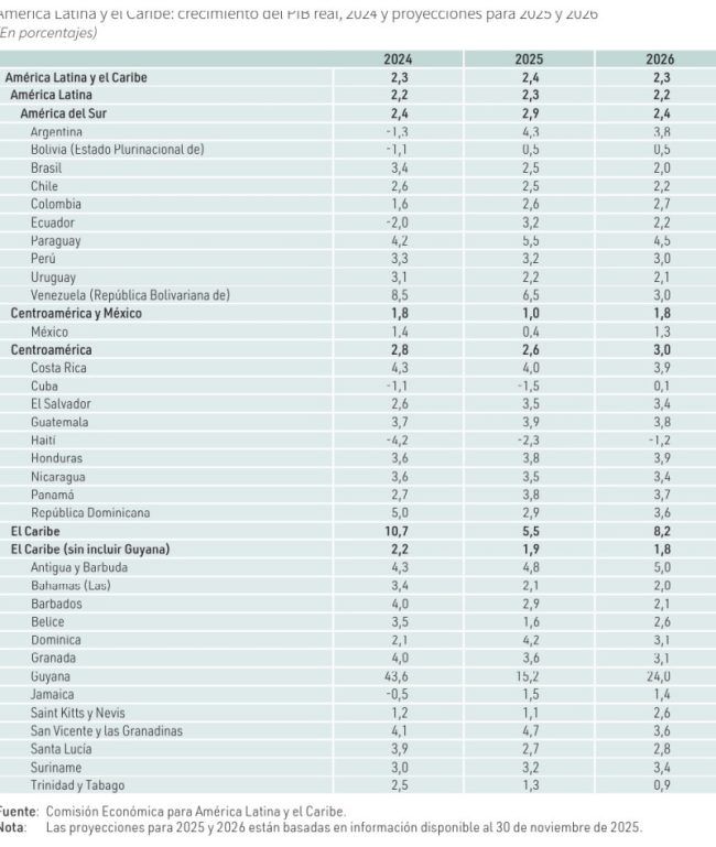 .República Dominicana creció 5% en 2024, 2.9% en 2025 y se proyecta que crezca 3.6% en 2026, según la Cepal.