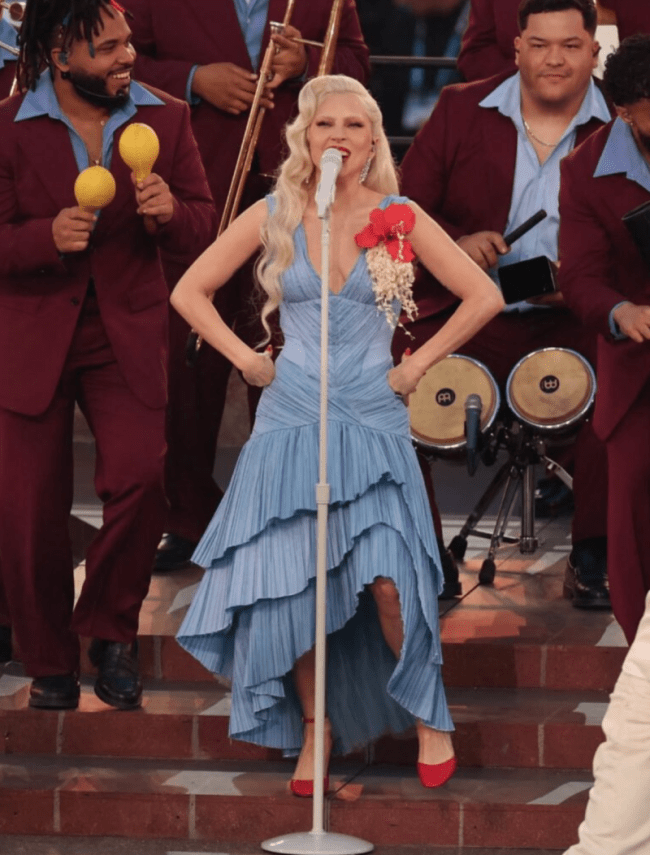El vestido estaba adornado con un detalle floral rojo, colocado sobre el pecho, en referencia directa a la Flor de Maga, la flor nacional de Puerto Rico. Este guiño no solo funcionó como un toque visual, sino como un tributo simbólico a la cultura del país natal de Bad Bunny, reforzando el mensaje de unidad y celebración latina que marcó toda la presentación.