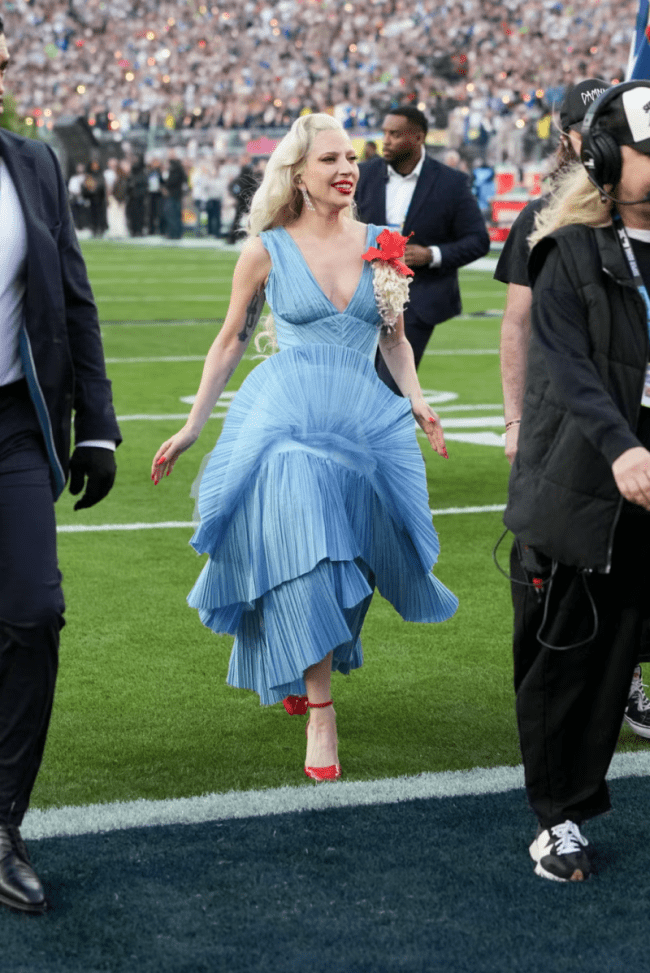 Para su participación en el show de Bad Bunny, Gaga eligió un vestido hecho a medida por Luar, la marca del diseñador dominicano Raúl López. Esta elección fue tan significativa como el propio momento en que subió al escenario: un gesto de respeto y unión cultural en un espectáculo que destacó la identidad latina en pleno corazón del Super Bowl.