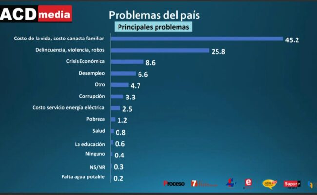 De acuerdo con los datos arrojados por la encuesta ACD Media en su primera entrega a pesar de lo debatido ampliamente en los medios y escenarios políticos del pais, la corrupción como preocupación de la población se ubica en un lejano sexto lugar en tanto que los altos precios de la canasta familiar, la inseguridad, la crisis económica y el desempleo, ocupan los primeros lugares como tema que angustian y tienen la mayor atención de los dominicanos.