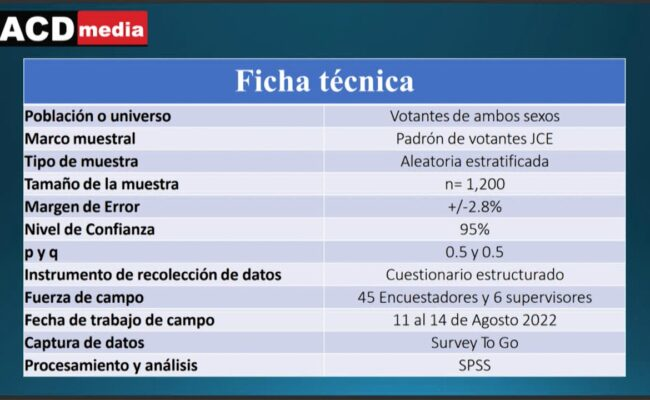 Con una Ficha Técnica que indica se encuestaron de manera presencial, casa por casa, a ciudadanos inscritos en el padrón electoral de la Junta Central Electoral, JCE, es decir votantes, con edades de 18 anos en adelante, unos 1,200 dominicanos, en todas las regiones del pais, un tipo de muestra aleatoria estratificada, con un margen de error de +-2.8%, dirigido el equipo de la encuesta por el estadígrafo y académico universitario José Eligio Peralta, profesor de maestrías en la Universidad Autónoma de Santo Domingo, UASD.