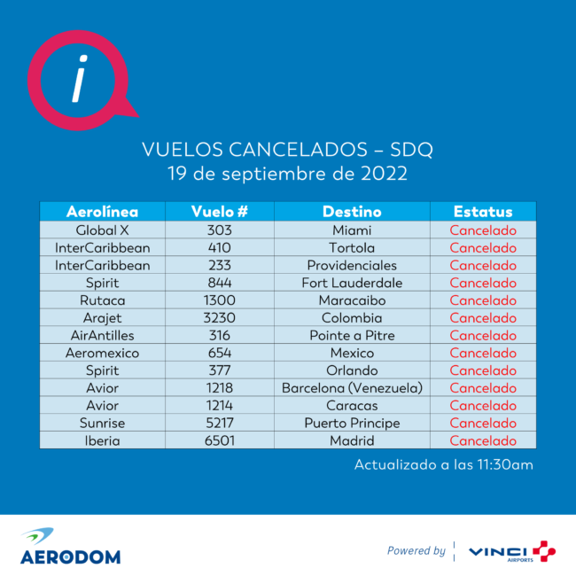 Entre los vuelos cancelados con salida desde el Aeropuerto Internacional de Las Américas están el número 303 por la compañía Global X, con destino a la ciudad de Miami en Estados Unidos; el 107 de Copa que saldría a Panamá; el 410 de la aerolínea InterCaribbean con destino a la Isla Tórtola; el 233 de esta última compañía, pero que saldría hacia Providenciales y el vuelo deSpirit número 844 que iría a Fort Lauderdale.