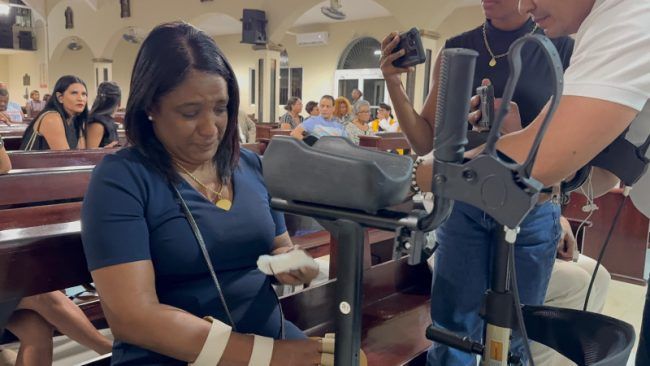 Con andador y llevando una férula en el brazo derecho, Claribel Castro acudió a la misa, una de las sobrevivientes, y quien perdió en el fatídico a su hija, Clarisleny Peguero Castro.