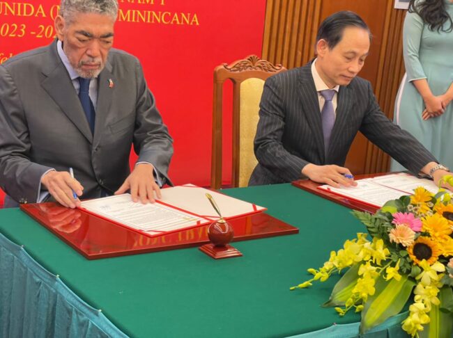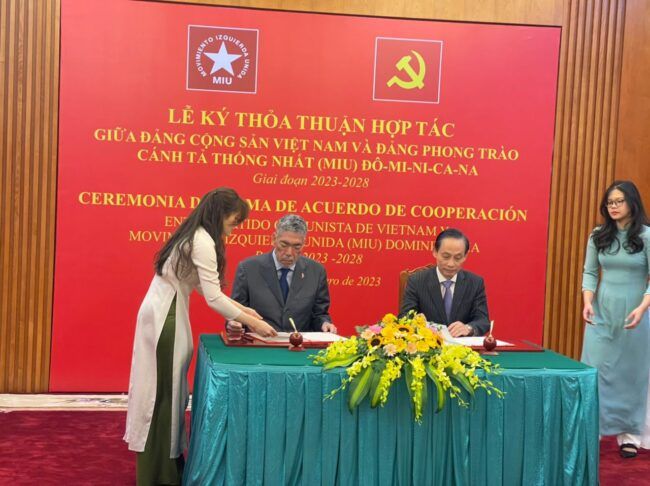 Por el Partido Comunista De Vietnan firmó el acuerdo el Presidente de la Comisión de Relaciones Exteriores de esa entidad , Le Hoai Trung Y el señor Miguel Mejía, Secretario General del Movimiento Izquierda Unida, de República Dominicana.