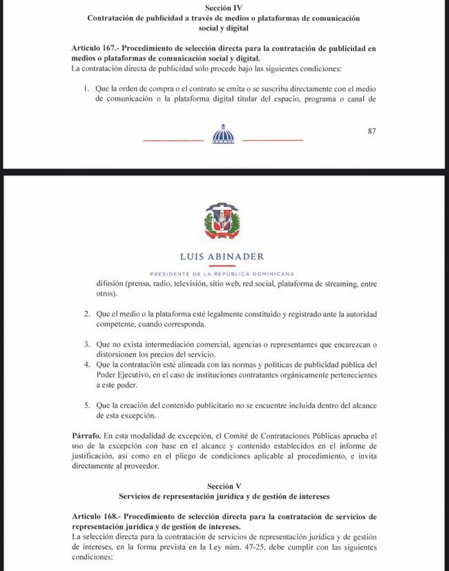 La nueva Ley de Compras y Contrataciones Públicas (Ley 47-25) y su reglamento de aplicación establecen que la publicidad oficial del Estado deberá contratarse de manera directa con los medios y plataformas de comunicación, prohibiendo expresamente el uso de agencias publicitarias u otras formas de intermediación.